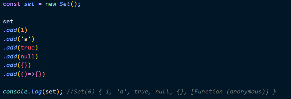 Set 객체는 객체나 배열과 같이 자바스크립트의 모든 값을 요소로 지정할 수 있다.