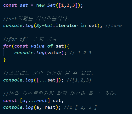 Set객체는 이터러블이다. 따라서 for of 문으로 순회 가능하며 스프레드 문법과 배열 디스트럭처링의 대상이 될 수도 있다.