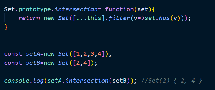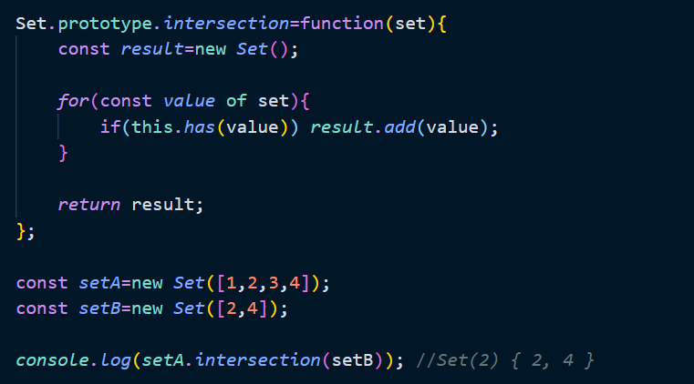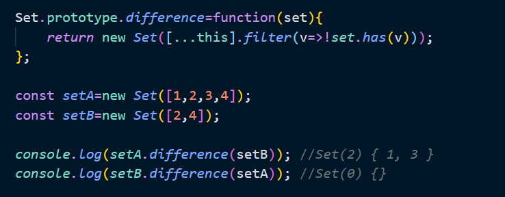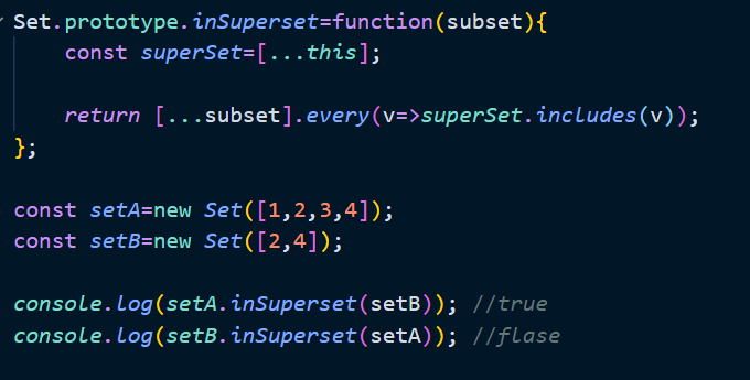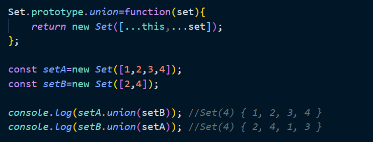 Set 객체는 수학적 집합을 구현하기 위한 자료구조이다. 따라서 set를 활용하여 교집합, 차집합, 합집합 등을 구현할 수 있다. 집합 연산을 구현한 프로토타입 메서드를 구현하면 다음과 같다.