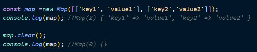 Map 객체의 요소를 일괄 삭제하려면 Map.prototype.clear 메서드를 사용한다. clear 메서드는 언제나 undefined 를 반환한다.