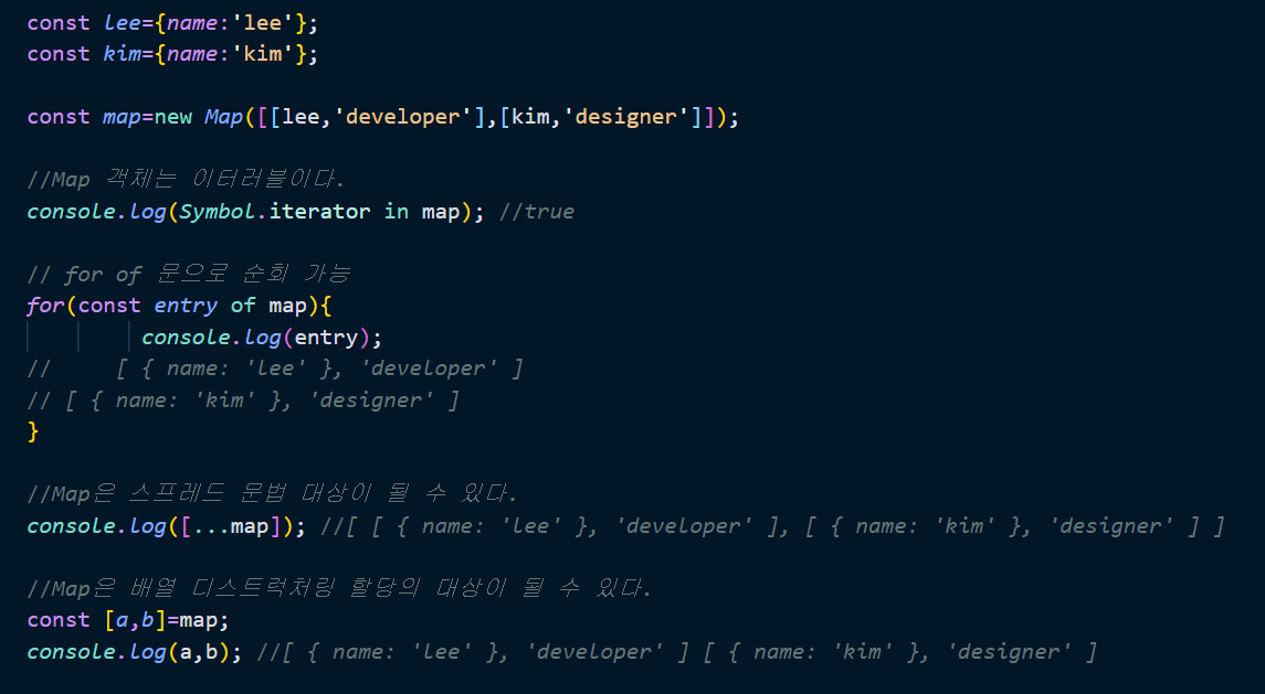 Map 객체는 이터러블이므로 for ...of 문으로 순회 가능하며 스프레드 문법과 배열 디스트럭처링 할당에 대상이 될 수 있다.