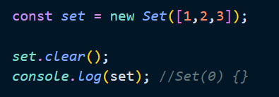 Set 객체의 요소를 일괄 삭제하려면 Set.prototype.clear 메서드를 사용한다. clear메서드는 언제나 undefined를 반환한다.