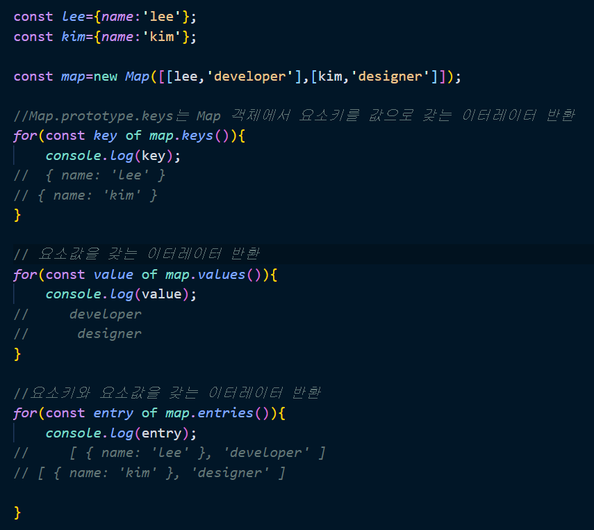 Map 객체는 이터러블이면서 동시에 이터레이터인 객체를 반환하는 메서드를 제공한다.