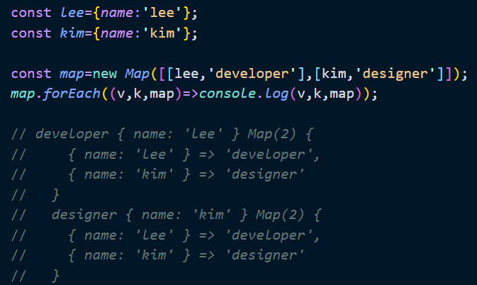 Map 객체의 요소를 순회하려면 Map.prototype.forEach 메서드를 사용한다 Array.prototype.forEach 와 유사하게 콜백 함수와 forEach메서드의 콜백함수 내부에서 this로 사용될 객체를 인수로 전달한다. 콜백 함수는 다음과 같이 3개의 인수를 전달한다.