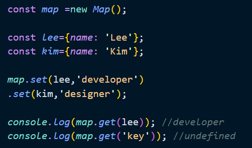 Map 객체에서 특정 요소를 취득하려면 Map.prototype.get 메서드를 사용한다. get 메서드의 인수로 키를 전달하면 Map객체에서 인수로 전달한 키를 갖는 값을 반환한다. 키를 갖는 요소가 존재하지 않으면 undefined를 반환한다.
